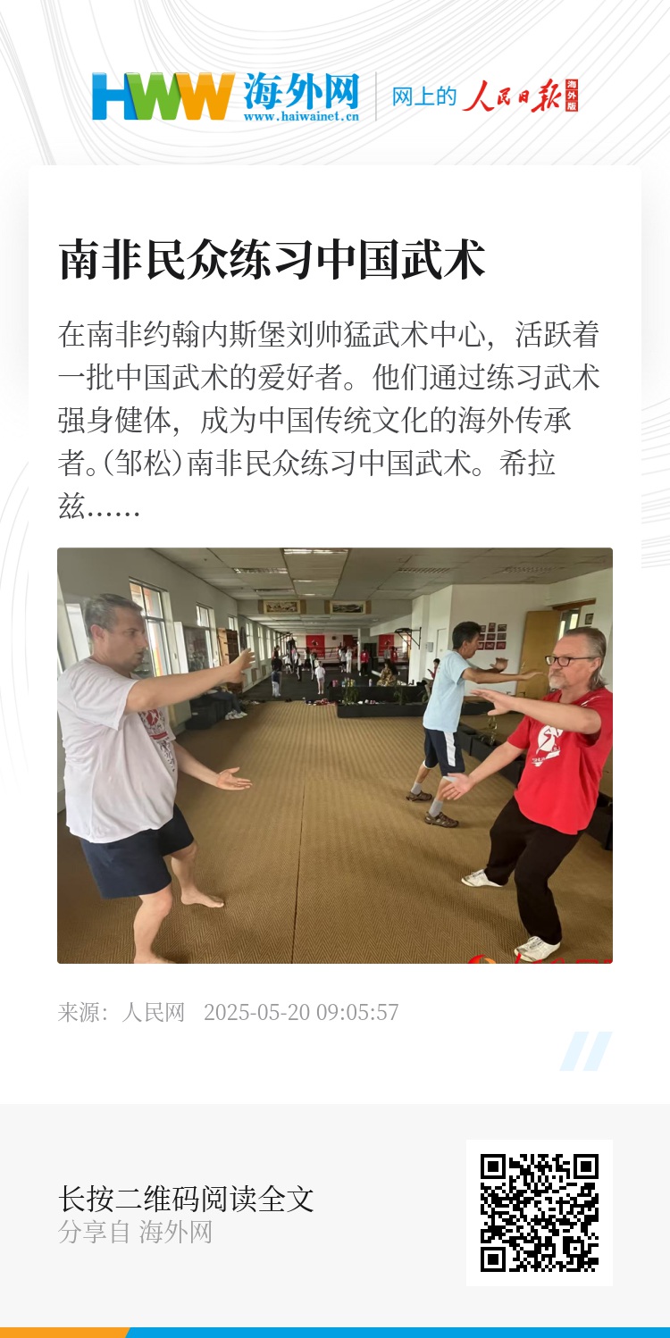 在南非约翰内斯堡刘帅猛武术中心,活跃着一批中国武术的爱好者。他们通过练习武术强身健体,成为中国传统文化的海外传承者。(邹松)