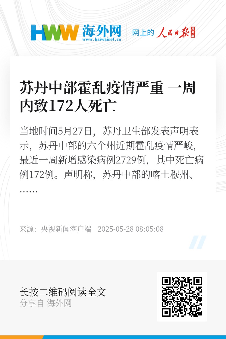世界卫生组织27日就苏丹卫生局势发布报告称,自2023年4月苏丹武装冲突爆发以来,苏丹医疗卫生系统濒临崩溃,霍乱、登革热等多种传染性疾病在苏丹大规模传播。截至2025年4月,苏丹已报告近6万例霍乱病例,其中1640多人死亡。