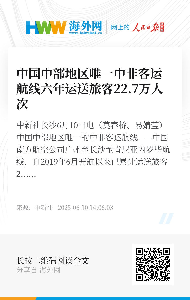 中新社长沙6月10日电(莫春桥、易婧莹)中国中部地区唯一的中非客运航线——中国南方航空公司广州至长沙至肯尼亚内罗毕航线,自2019年6月开航以来已累计运送旅客22.7万人次,运输货邮超7000吨,为中非经贸往来架起稳定的“空中通道”。