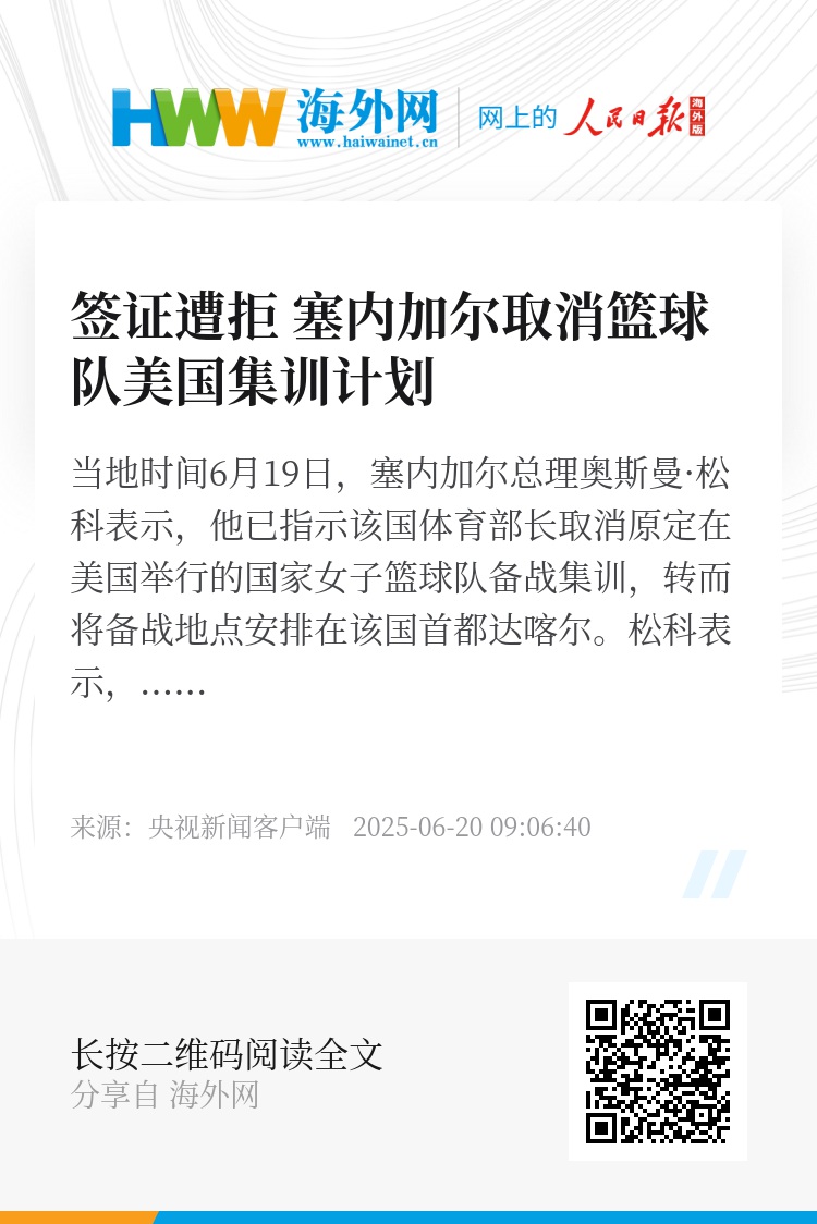 当地时间6月19日,塞内加尔总理奥斯曼·松科表示,他已指示该国体育部长取消原定在美国举行的国家女子篮球队备战集训,转而将备战地点安排在该国首都达喀尔。
