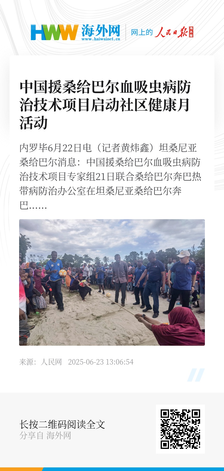 人民网内罗毕6月22日电(记者黄炜鑫)坦桑尼亚桑给巴尔消息:中国援桑给巴尔血吸虫病防治技术项目专家组21日联合桑给巴尔奔巴热带病防治办公室在坦桑尼亚桑给巴尔奔巴岛启动“提升健康素养,预防血吸虫病”主题社区健康教育月活动。