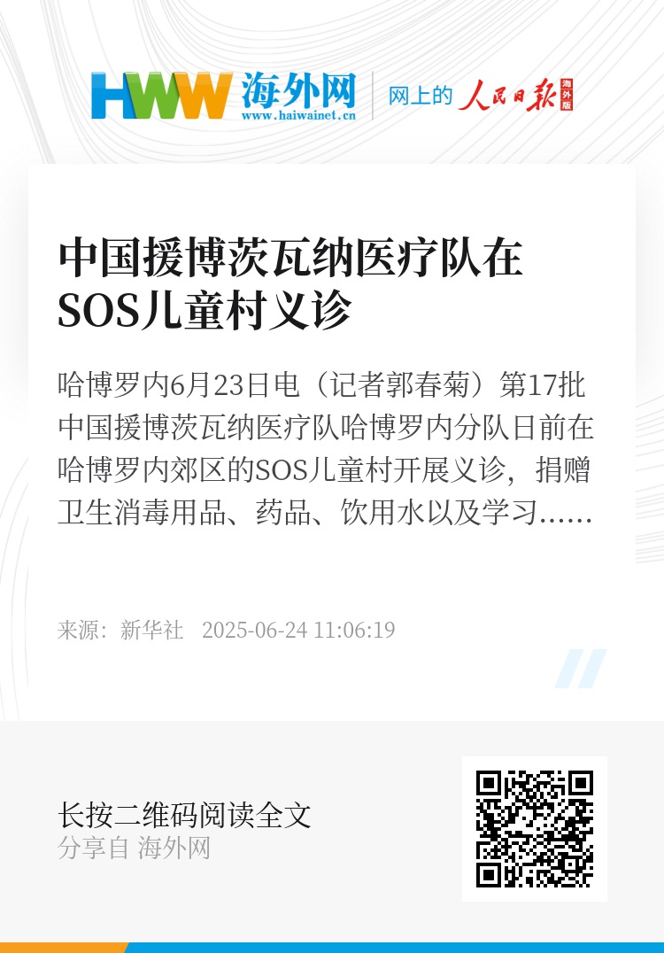 新华社哈博罗内6月23日电(记者郭春菊)第17批中国援博茨瓦纳医疗队哈博罗内分队日前在哈博罗内郊区的SOS儿童村开展义诊,捐赠卫生消毒用品、药品、饮用水以及学习和体育用品,并为当地民众举行科普讲座和健康咨询。