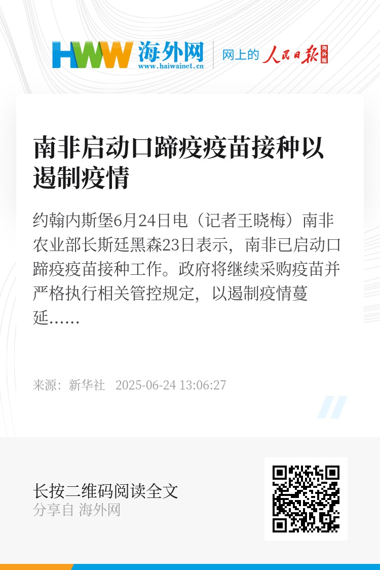 新华社约翰内斯堡6月24日电(记者王晓梅)南非农业部长斯廷黑森23日表示,南非已启动口蹄疫疫苗接种工作。政府将继续采购疫苗并严格执行相关管控规定,以遏制疫情蔓延。