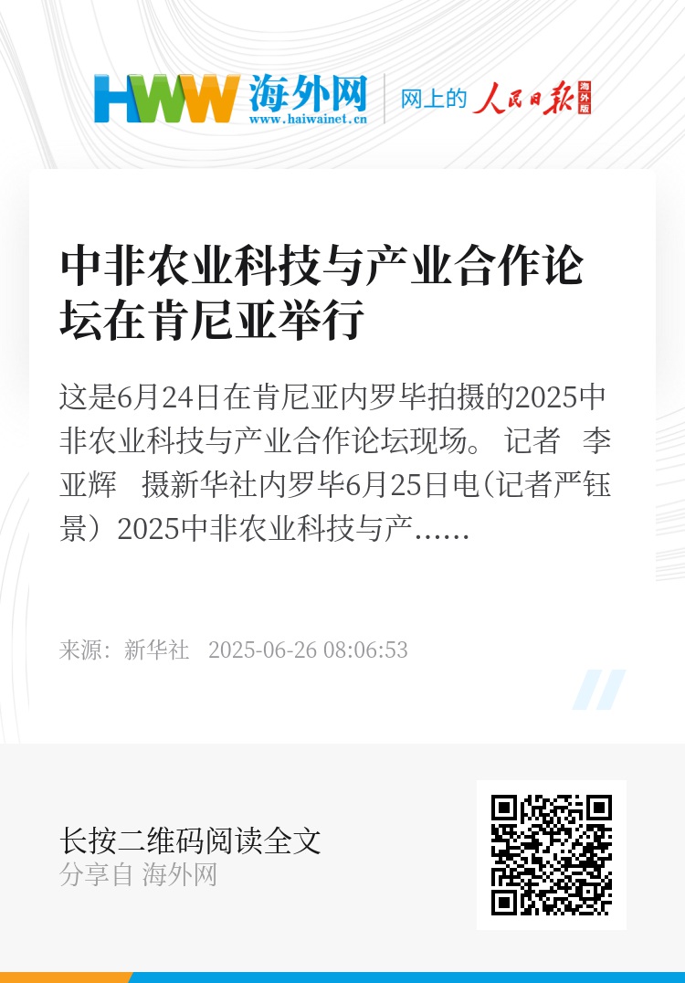 新华社内罗毕6月25日电(记者严钰景)2025中非农业科技与产业合作论坛24日在肯尼亚首都内罗毕举行,来自中非双方政府部门、企业、大学、研究机构、国际组织的200余名代表参会。