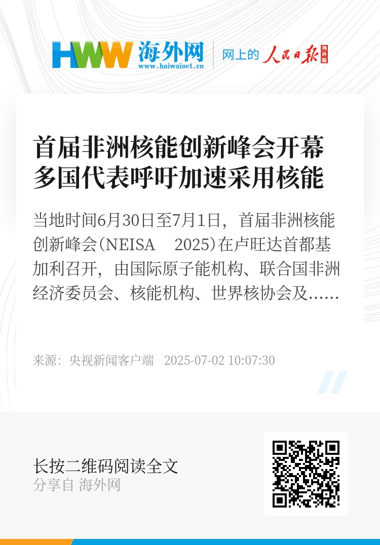当地时间6月30日至7月1日,首届非洲核能创新峰会(NEISA 2025)在卢旺达首都基加利召开,由国际原子能机构、联合国非洲经济委员会、核能机构、世界核协会及主要地区金融机构等重要国际组织联合主办,旨在将核能确立为非洲可持续发展的关键支柱。与会非洲代表呼吁加速采用核能,以满足非洲大陆不断增长的能源需求、支持工业化进程并推动可持续发展。