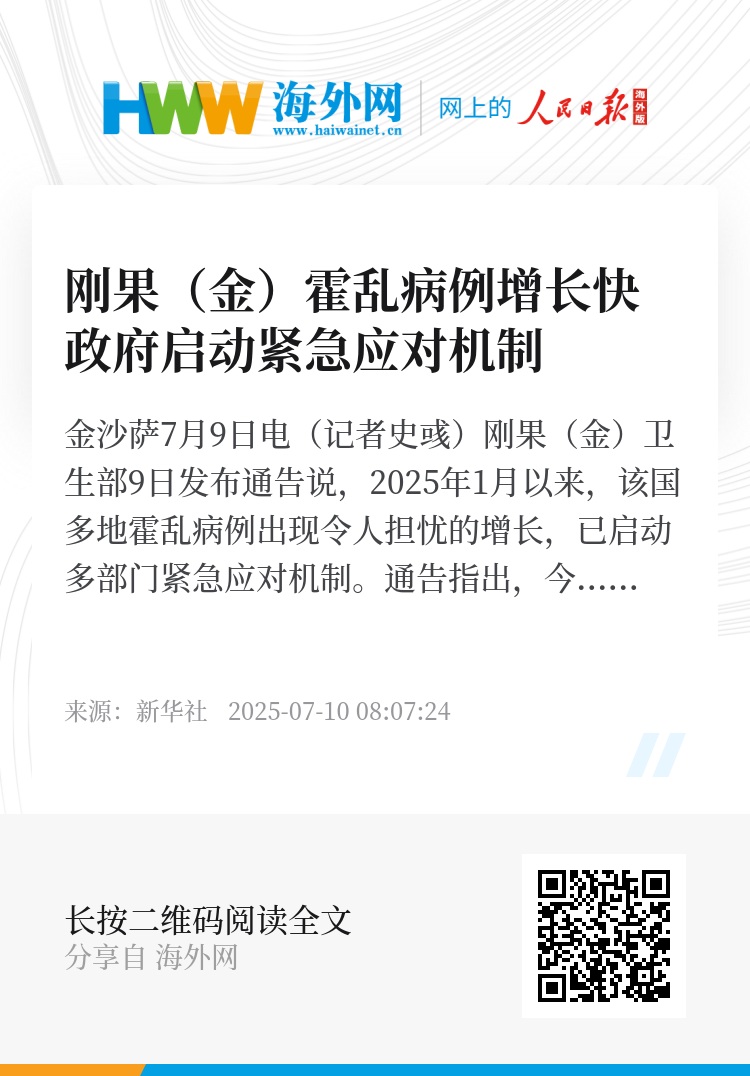 新华社金沙萨7月9日电(记者史彧)刚果(金)卫生部9日发布通告说,2025年1月以来,该国多地霍乱病例出现令人担忧的增长,已启动多部门紧急应对机制。