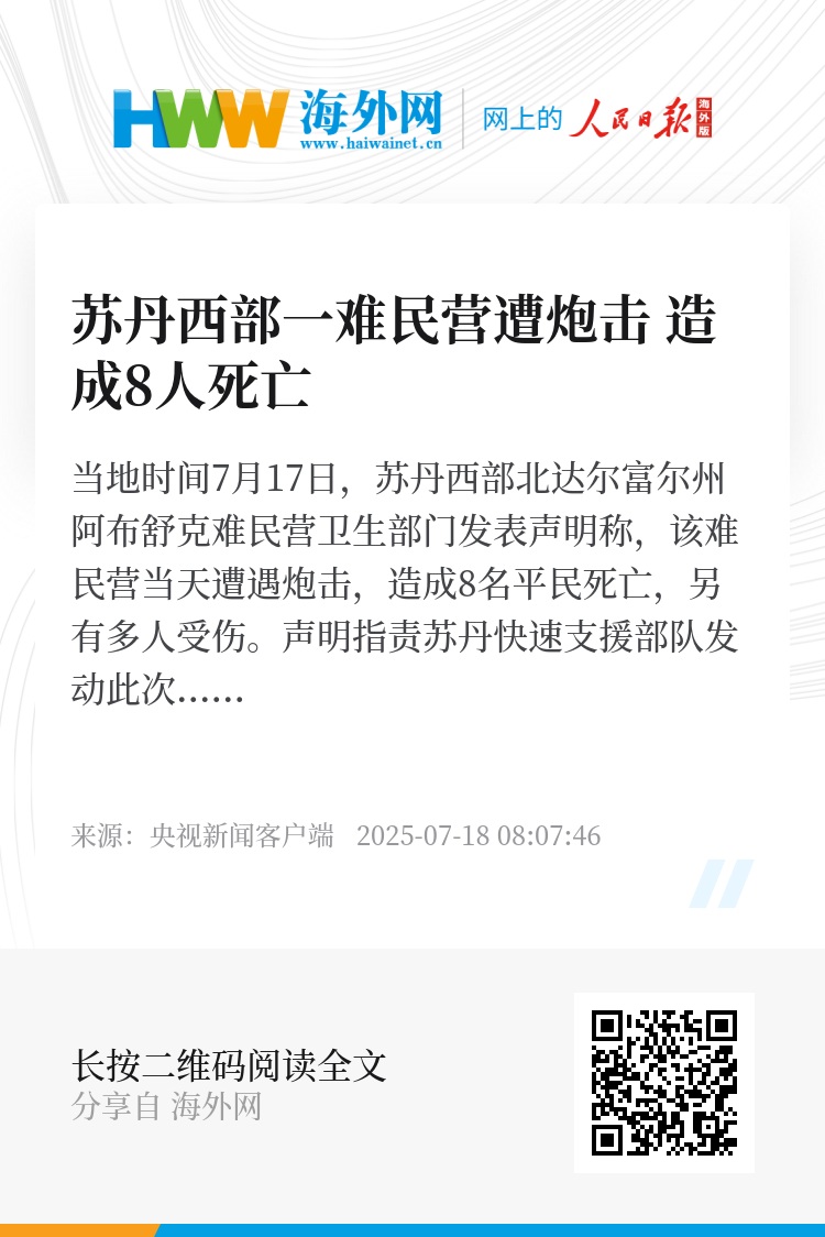 当地时间7月17日,苏丹西部北达尔富尔州阿布舒克难民营卫生部门发表声明称,该难民营当天遭遇炮击,造成8名平民死亡,另有多人受伤。