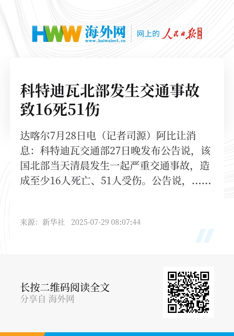 新华社达喀尔7月28日电(记者司源)阿比让消息:科特迪瓦交通部27日晚发布公告说,该国北部当天清晨发生一起严重交通事故,造成至少16人死亡、51人受伤。