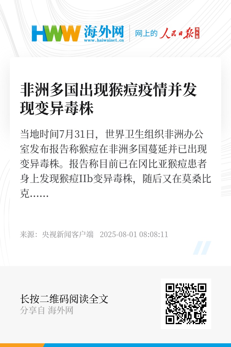 当地时间7月31日,世界卫生组织非洲办公室发布报告称猴痘在非洲多国蔓延并已出现变异毒株。