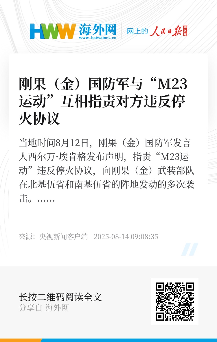 当地时间8月12日,刚果(金)国防军发言人西尔万·埃肯格发布声明,指责“M23运动”违反停火协议,向刚果(金)武装部队在北基伍省和南基伍省的阵地发动的多次袭击。刚果(金)武装部队谴责称,这是对多哈原则声明的故意和公然违反。