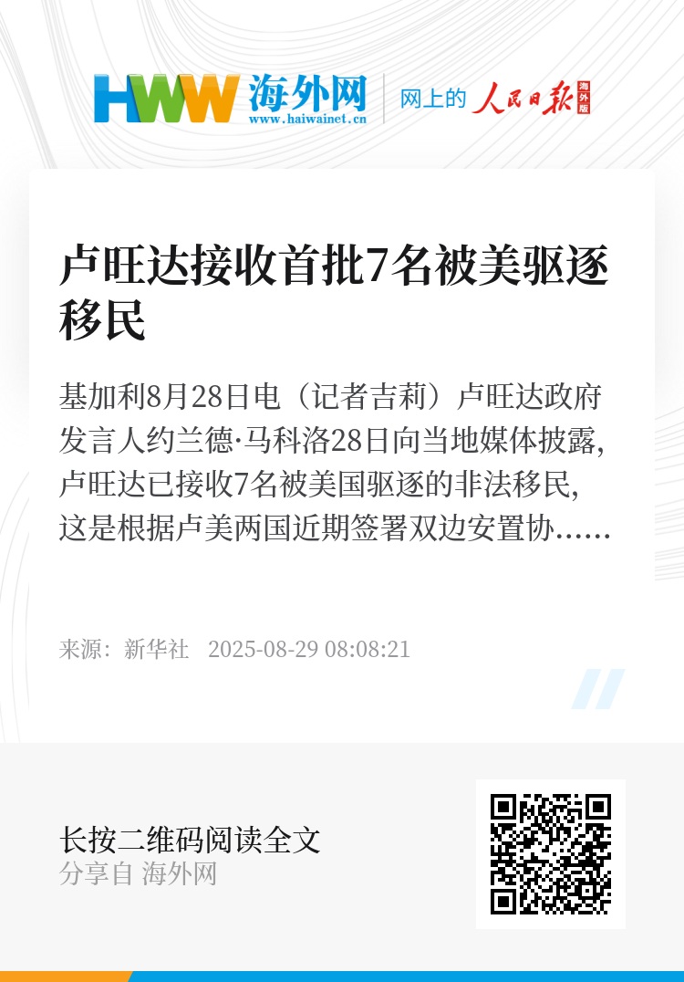 新华社基加利8月28日电(记者吉莉)卢旺达政府发言人约兰德·马科洛28日向当地媒体披露,卢旺达已接收7名被美国驱逐的非法移民,这是根据卢美两国近期签署双边安置协议抵达的首批移民。