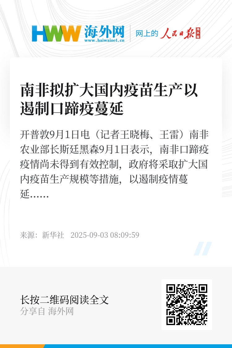 新华社开普敦9月1日电(记者王晓梅、王雷)南非农业部长斯廷黑森9月1日表示,南非口蹄疫疫情尚未得到有效控制,政府将采取扩大国内疫苗生产规模等措施,以遏制疫情蔓延。