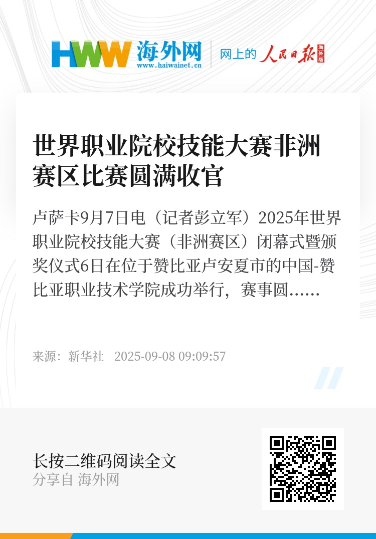 新华社卢萨卡9月7日电(记者彭立军)2025年世界职业院校技能大赛(非洲赛区)闭幕式暨颁奖仪式6日在位于赞比亚卢安夏市的中国-赞比亚职业技术学院成功举行,赛事圆满落幕。