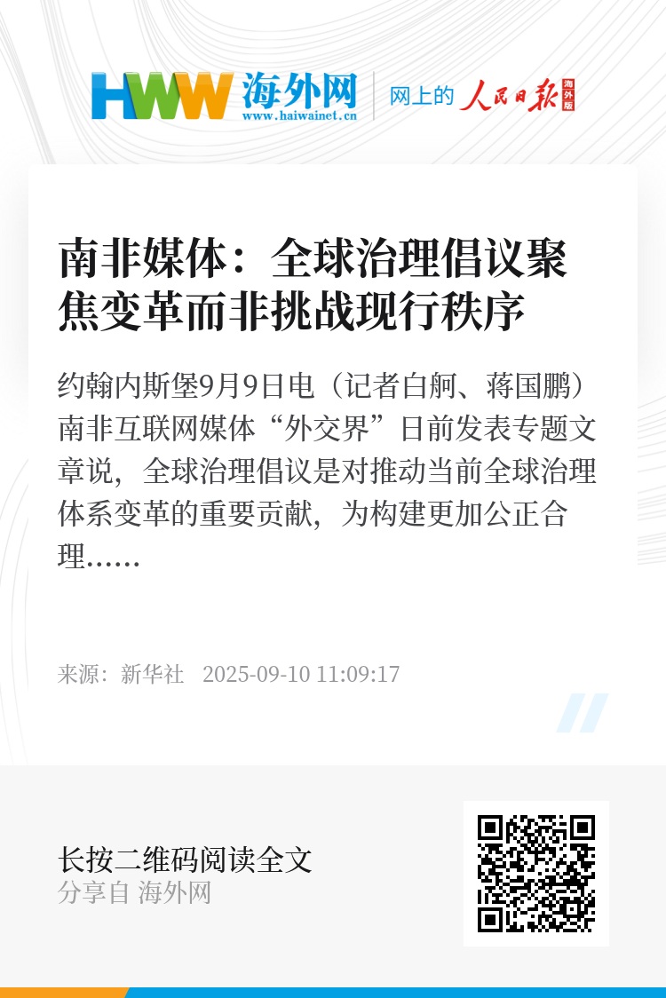 新华社约翰内斯堡9月9日电(记者白舸、蒋国鹏)南非互联网媒体“外交界”日前发表专题文章说,全球治理倡议是对推动当前全球治理体系变革的重要贡献,为构建更加公正合理的国际秩序提供了中国方案。文章摘要如下: