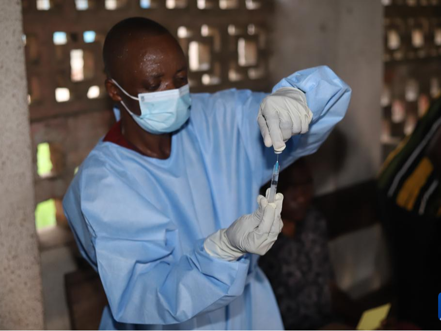 9月13日,在刚果(金)开赛省布拉佩卫生区,医护人员准备注射埃博拉疫苗。新华社发(世界卫生组织供图/若埃尔·伦巴拉摄)