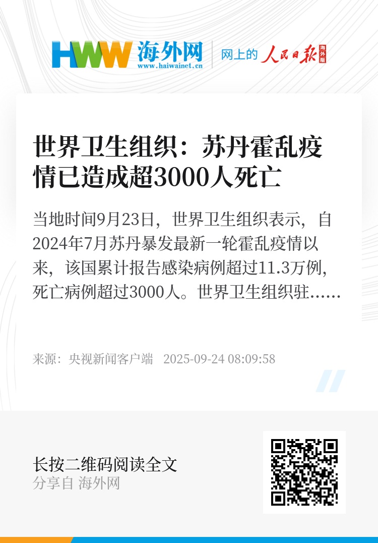 当地时间9月23日,世界卫生组织表示,自2024年7月苏丹暴发最新一轮霍乱疫情以来,该国累计报告感染病例超过11.3万例,死亡病例超过3000人。