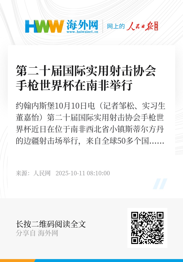 人民网约翰内斯堡10月10日电(记者邹松、实习生董嘉怡)第二十届国际实用射击协会手枪世界杯近日在位于南非西北省小镇斯蒂尔方丹的边疆射击场举行,来自全球50多个国家的选手参赛。