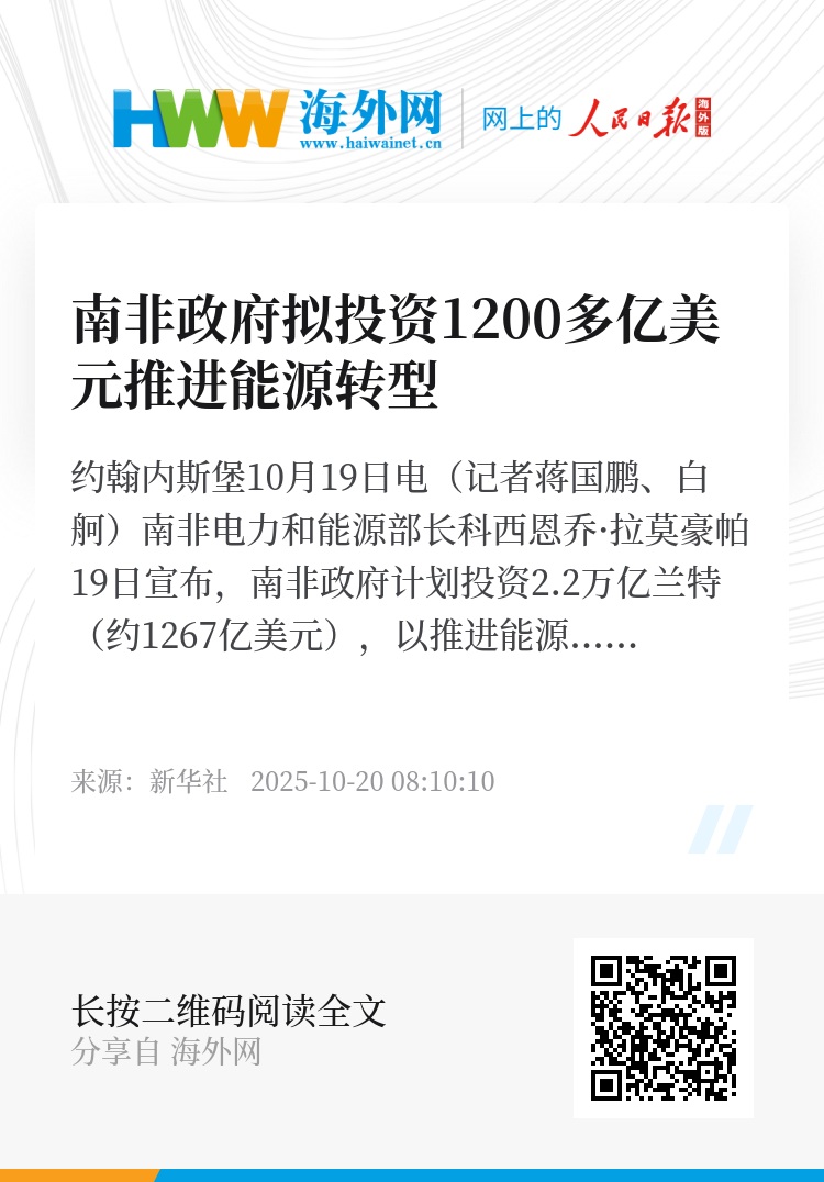 新华社约翰内斯堡10月19日电(记者蒋国鹏、白舸)南非电力和能源部长科西恩乔·拉莫豪帕19日宣布,南非政府计划投资2.2万亿兰特(约1267亿美元),以推进能源转型,解决长期困扰该国的电力供应问题,推动经济增长。