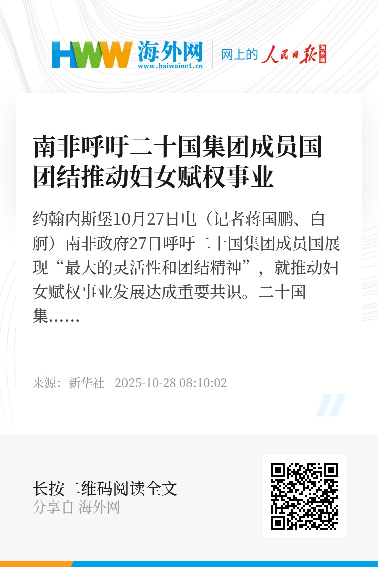 新华社约翰内斯堡10月27日电(记者蒋国鹏、白舸)南非政府27日呼吁二十国集团成员国展现“最大的灵活性和团结精神”,就推动妇女赋权事业发展达成重要共识。