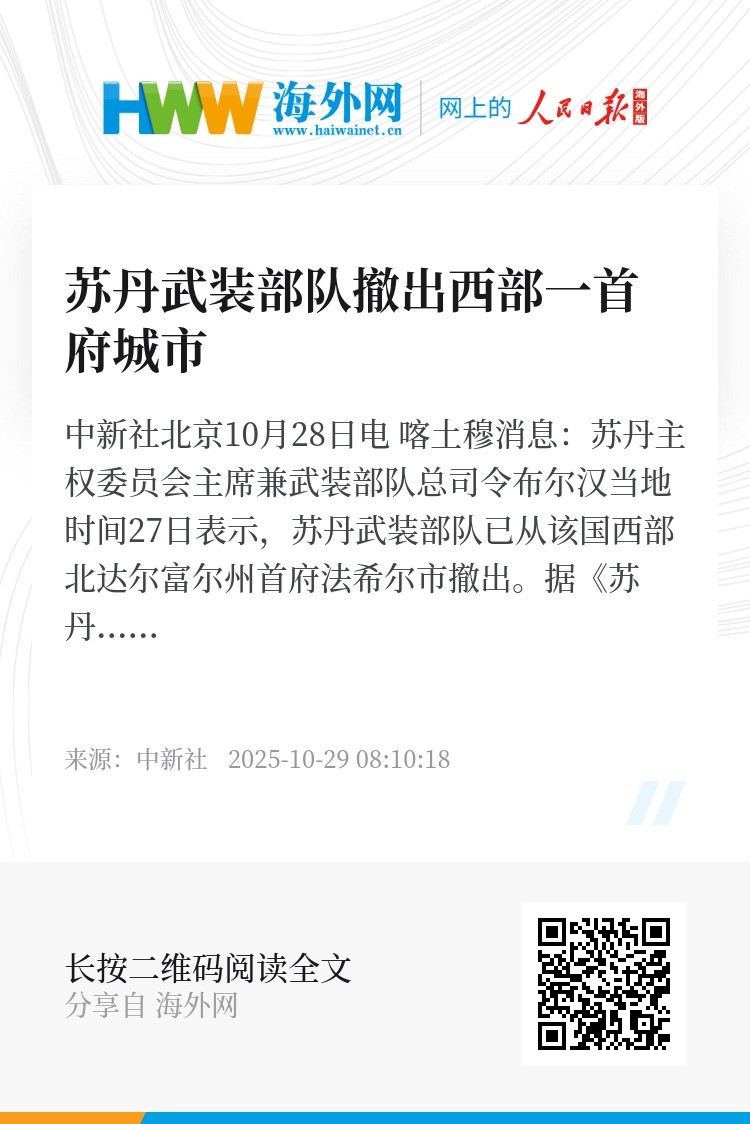 中新社北京10月28日电 喀土穆消息:苏丹主权委员会主席兼武装部队总司令布尔汉当地时间27日表示,苏丹武装部队已从该国西部北达尔富尔州首府法希尔市撤出。