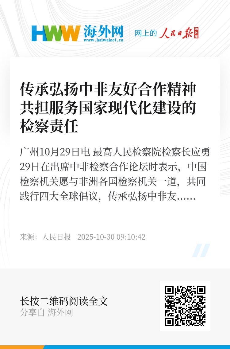 新华社广州10月29日电 最高人民检察院检察长应勇29日在出席中非检察合作论坛时表示,中国检察机关愿与非洲各国检察机关一道,共同践行四大全球倡议,传承弘扬中非友好合作精神,落实《中非合作论坛—北京行动计划(2025—2027)》,加强互学互鉴,深化交流合作,共担服务国家现代化建设的检察责任。