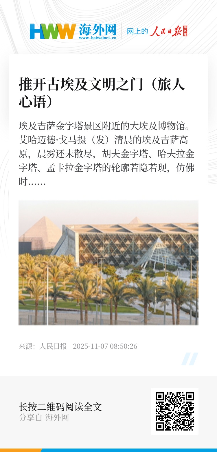 离馆时回望,大埃及博物馆犹如一把插入时间之锁的钥匙。站在时光的门口,我试图听懂石头的喃喃低语。它告诉我:博物馆是连接过去与未来的驿站,散落的记忆在此重聚,中断的对话在此继续,今人与古人在某个光影交错的瞬间,共享同一次心跳。(黄培昭)