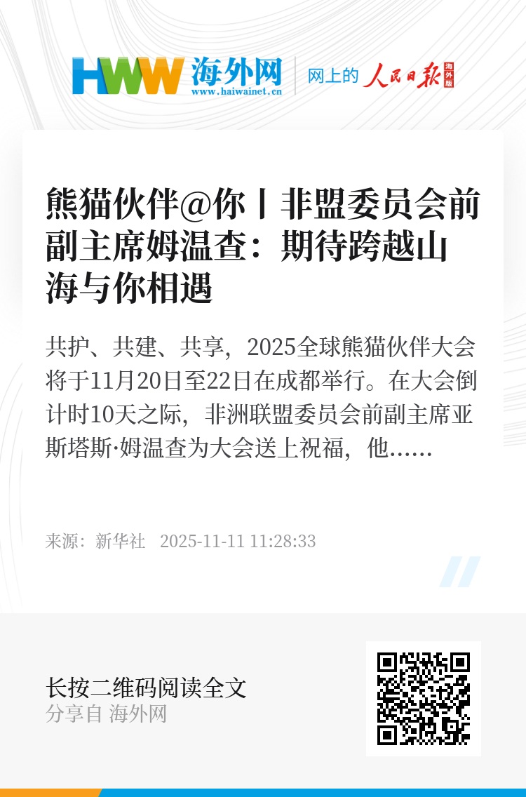 共护、共建、共享,2025全球熊猫伙伴大会将于11月20日至22日在成都举行。在大会倒计时10天之际,非洲联盟委员会前副主席亚斯塔斯·姆温查为大会送上祝福,他表示:“期待在这场跨越山海的生命之约中与你相遇,让萌动全球的熊猫微笑,成为连接世界最美的语言。”