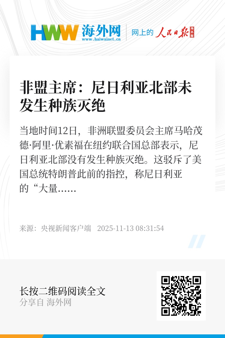 当地时间12日,非洲联盟委员会主席马哈茂德·阿里·优素福在纽约联合国总部表示,尼日利亚北部没有发生种族灭绝。这驳斥了美国总统特朗普此前的指控,称尼日利亚的“大量”基督徒遭到杀害。优素福表示,发表此类言论前请三思,极端组织“博科圣地”的首批受害者是穆斯林,而不是基督徒。