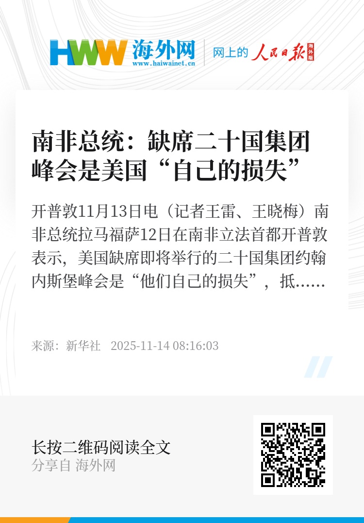 新华社开普敦11月13日电(记者王雷、王晓梅)南非总统拉马福萨12日在南非立法首都开普敦表示,美国缺席即将举行的二十国集团约翰内斯堡峰会是“他们自己的损失”,抵制峰会的做法只会“适得其反”。