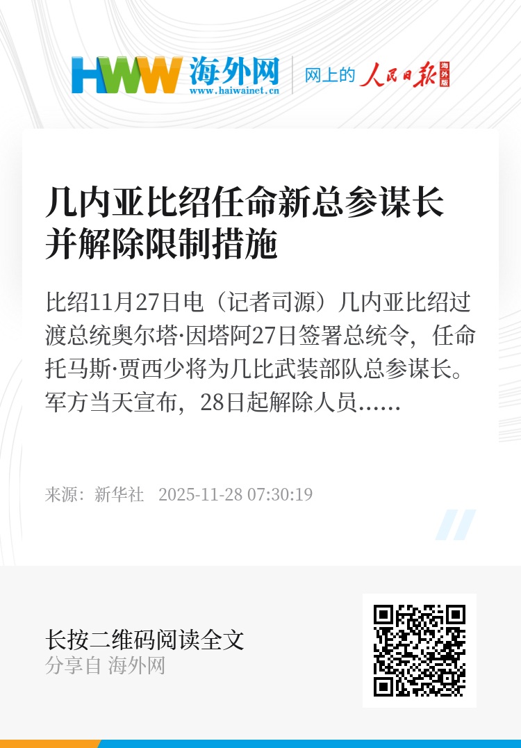新华社比绍11月27日电(记者司源)几内亚比绍过渡总统奥尔塔·因塔阿27日签署总统令,任命托马斯·贾西少将为几比武装部队总参谋长。军方当天宣布,28日起解除人员和物资流动限制措施。