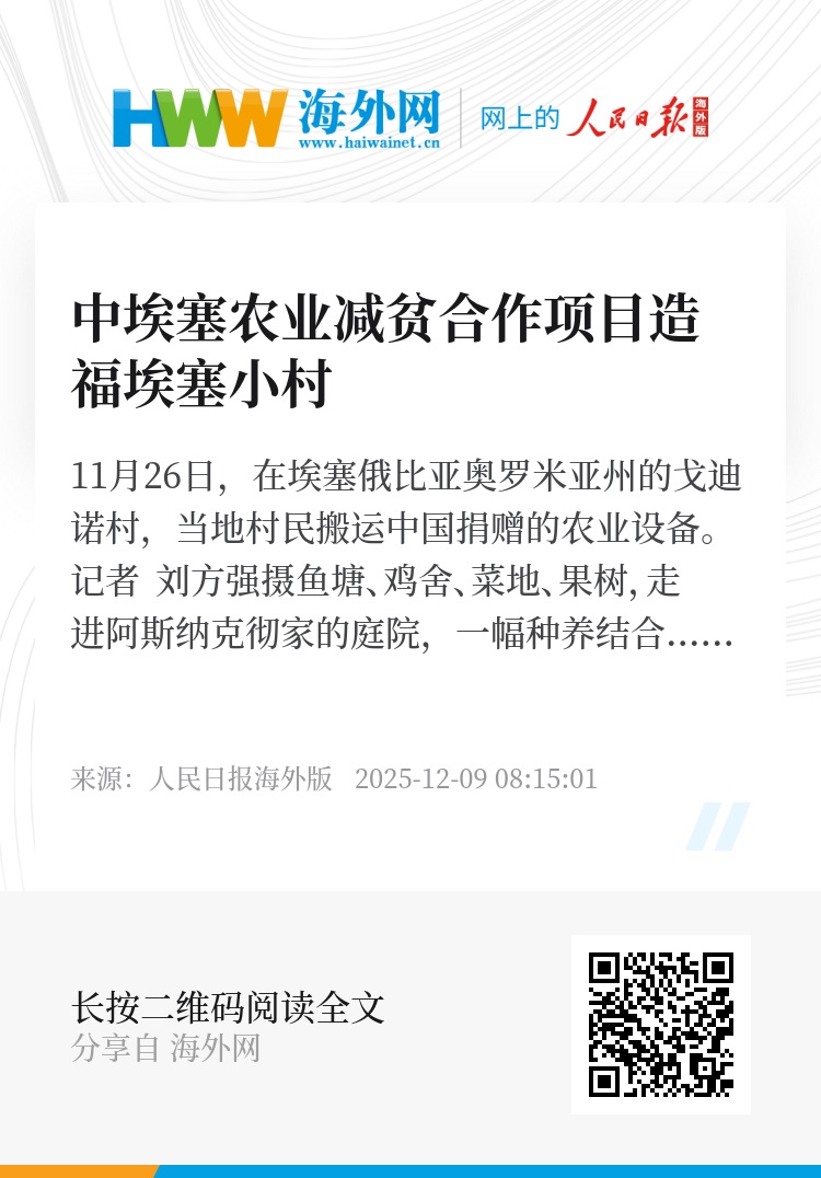 据了解,专家组共有8名成员,于2024年8月抵达埃塞执行援助任务。2025年5月底,在埃塞农业部和当地政府支持下,中埃塞农业减贫示范村项目在戈迪诺村启动。中国农业专家借鉴中国减贫经验,结合埃塞实际,通过向农户提供种子、种畜、农资和农机具,推广中国高产种植、健康养殖、节水灌溉等技术,帮助村民减贫,实现可持续发展。