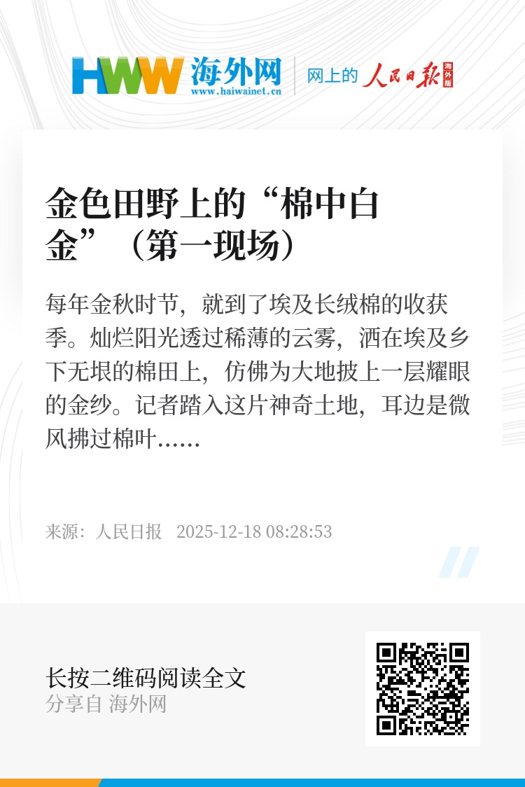河风拂过,棉絮轻舞,远处的灌溉渠波光粼粼。赛义德站在棉田边远眺尼罗河,“我父亲教我种棉,现在我教儿子种棉。等明年,这片地要全部种上吉萨45。”在这片被尼罗河水滋养的土地上,“棉中白金”的故事正不断续写。