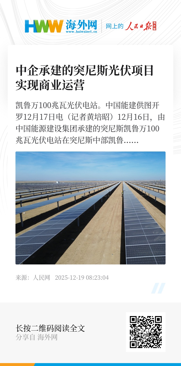 人民网开罗12月17日电(记者黄培昭)12月16日,由中国能源建设集团承建的突尼斯凯鲁万100兆瓦光伏电站在突尼斯中部凯鲁万省举行商业运营仪式,标志着该项目正式投入商业运行。