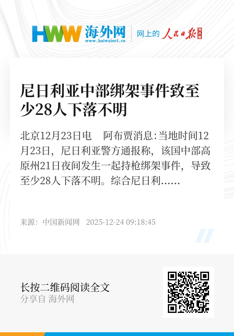 中新网北京12月23日电 阿布贾消息:当地时间12月23日,尼日利亚警方通报称,该国中部高原州21日夜间发生一起持枪绑架事件,导致至少28人下落不明。
