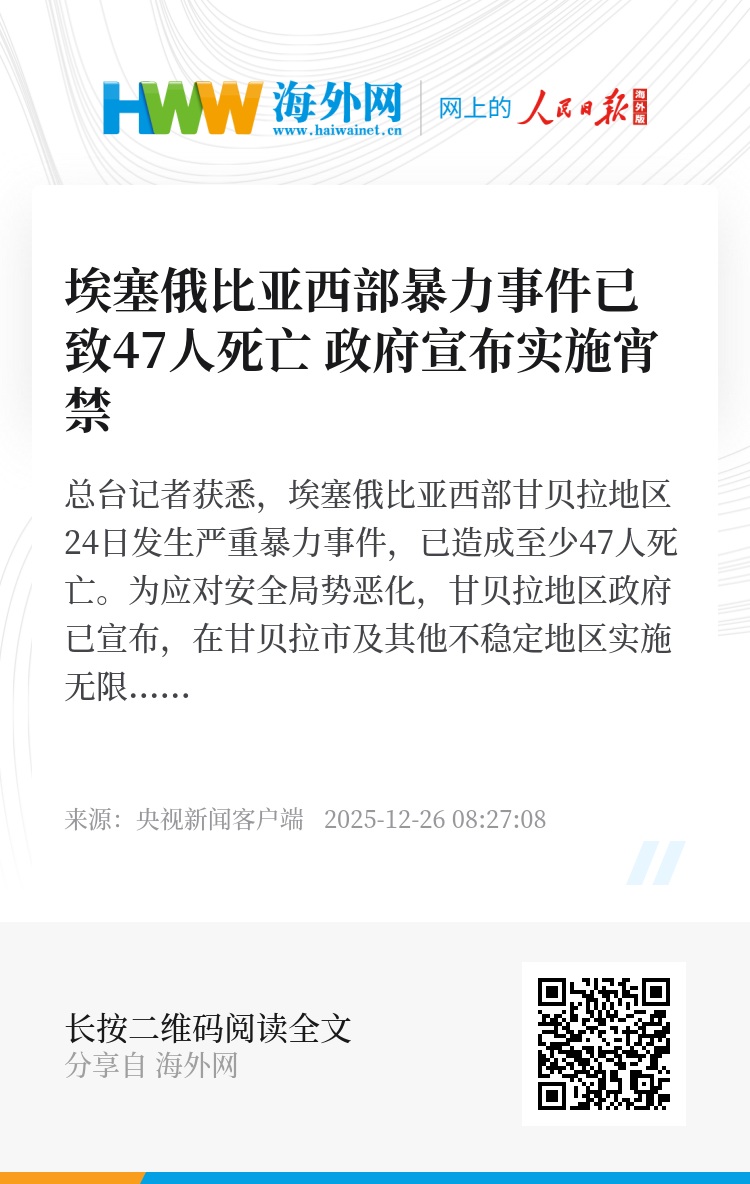 总台记者获悉,埃塞俄比亚西部甘贝拉地区24日发生严重暴力事件,已造成至少47人死亡。为应对安全局势恶化,甘贝拉地区政府已宣布,在甘贝拉市及其他不稳定地区实施无限期夜间宵禁。