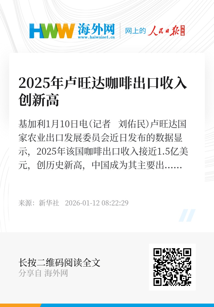 新华社基加利1月10日电(记者 刘佑民)卢旺达国家农业出口发展委员会近日发布的数据显示,2025年该国咖啡出口收入接近1.5亿美元,创历史新高,中国成为其主要出口市场之一。