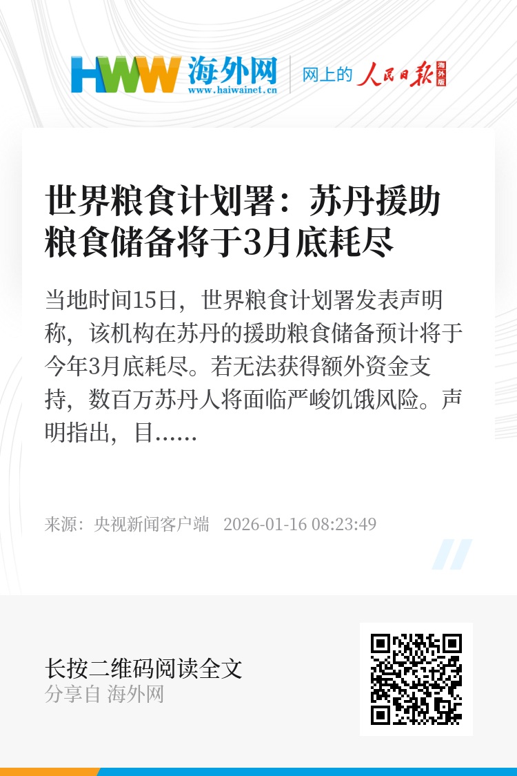 当地时间15日,世界粮食计划署发表声明称,该机构在苏丹的援助粮食储备预计将于今年3月底耗尽。若无法获得额外资金支持,数百万苏丹人将面临严峻饥饿风险。