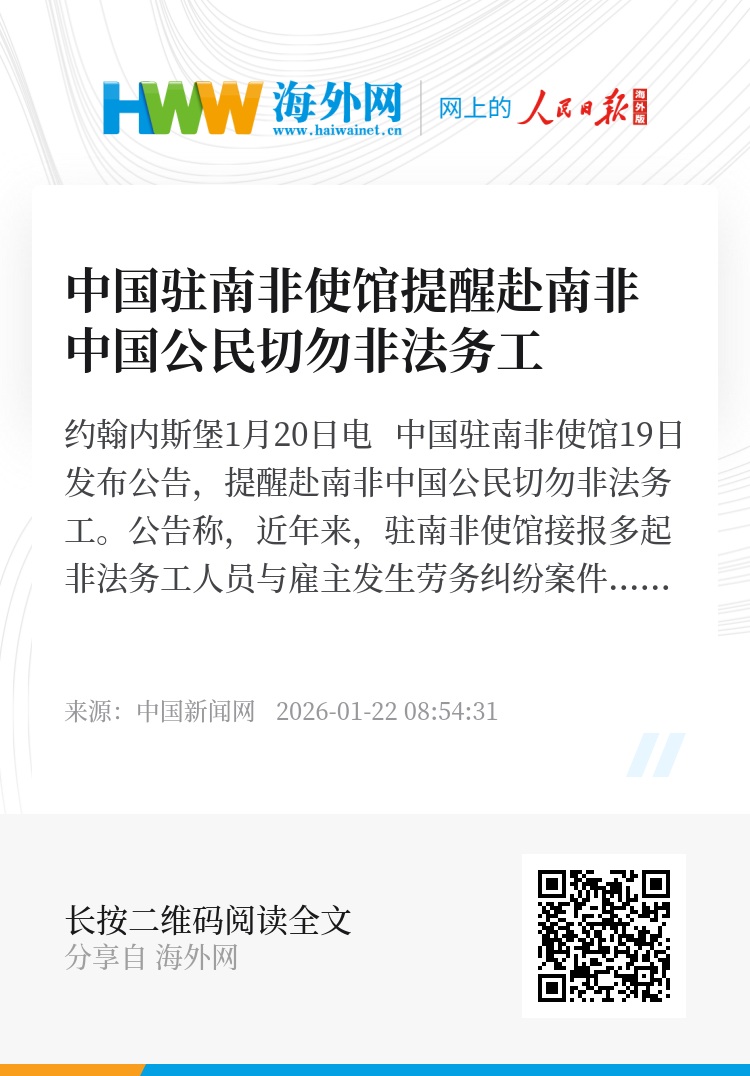 公告称,近年来,驻南非使馆接报多起非法务工人员与雇主发生劳务纠纷案件。当事人经国内亲友或“劳务中介”介绍赴南非务工,未签订正式劳务合同,未办理当地合法工作签证,上岗后发现工作内容、生活条件、薪酬待遇等与之前承诺不符,或遭遇长期欠薪、护照被扣等问题,有的还被南非执法部门羁押惩处,致使人身涉险、经济受损、生活无着。
