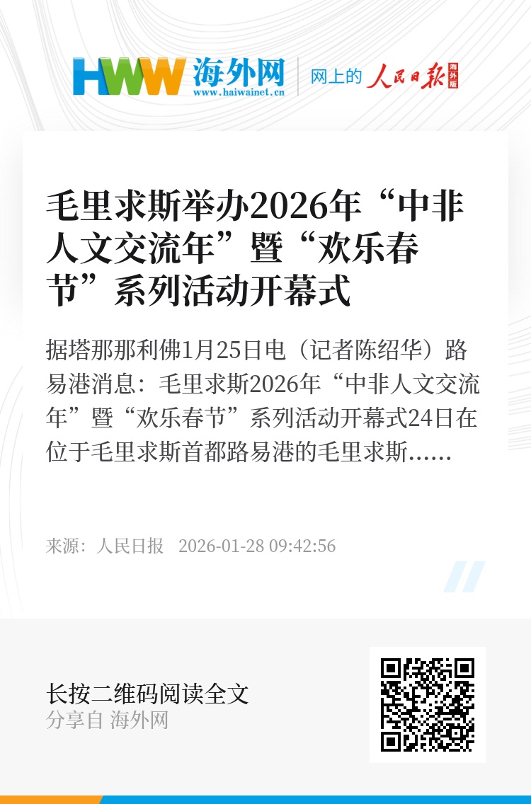 据新华社塔那那利佛1月25日电(记者陈绍华)路易港消息:毛里求斯2026年“中非人文交流年”暨“欢乐春节”系列活动开幕式24日在位于毛里求斯首都路易港的毛里求斯中国文化中心举办。中国驻毛里求斯大使黄世芳、毛里求斯艺术和文化部副部长韦罗妮克·勒—戈文德等嘉宾出席活动。