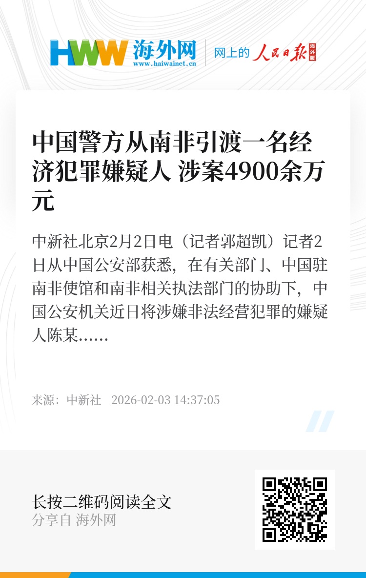 中新社北京2月2日电(记者郭超凯)记者2日从中国公安部获悉,在有关部门、中国驻南非使馆和南非相关执法部门的协助下,中国公安机关近日将涉嫌非法经营犯罪的嫌疑人陈某某从南非引渡回国。