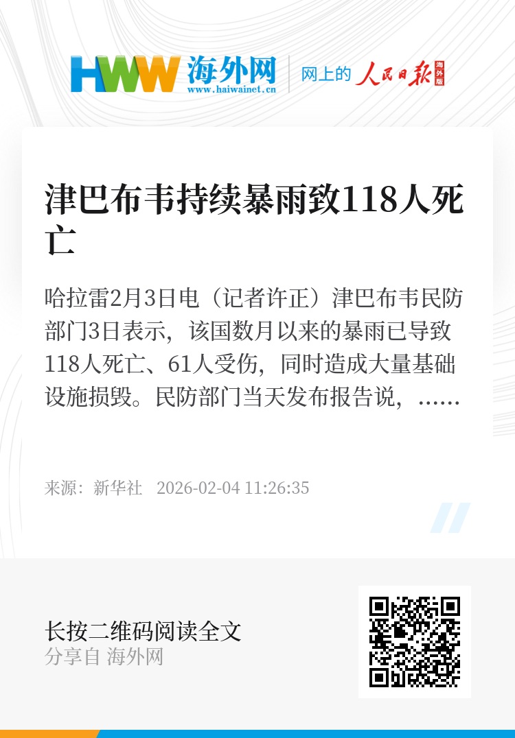 新华社哈拉雷2月3日电(记者许正)津巴布韦民防部门3日表示,该国数月以来的暴雨已导致118人死亡、61人受伤,同时造成大量基础设施损毁。