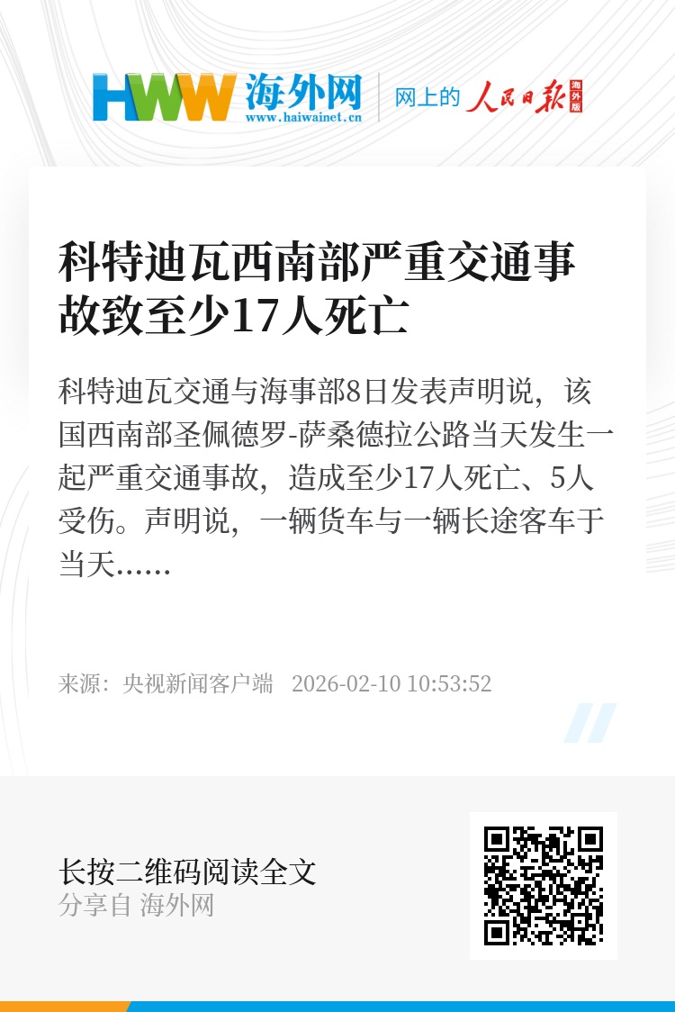 科特迪瓦交通与海事部8日发表声明说,该国西南部圣佩德罗-萨桑德拉公路当天发生一起严重交通事故,造成至少17人死亡、5人受伤。