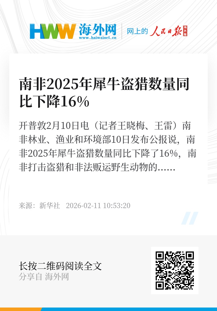 新华社开普敦2月10日电(记者王晓梅、王雷)南非林业、渔业和环境部10日发布公报说,南非2025年犀牛盗猎数量同比下降了16%,南非打击盗猎和非法贩运野生动物的努力取得成效。