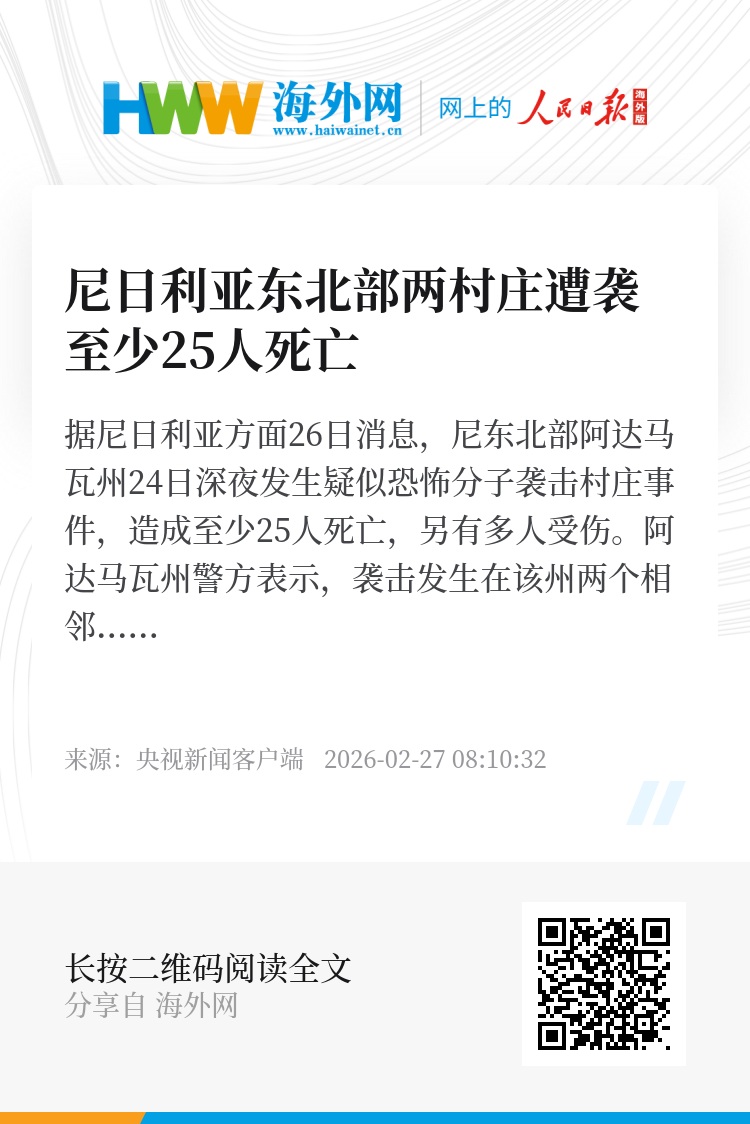 据尼日利亚方面26日消息,尼东北部阿达马瓦州24日深夜发生疑似恐怖分子袭击村庄事件,造成至少25人死亡,另有多人受伤。