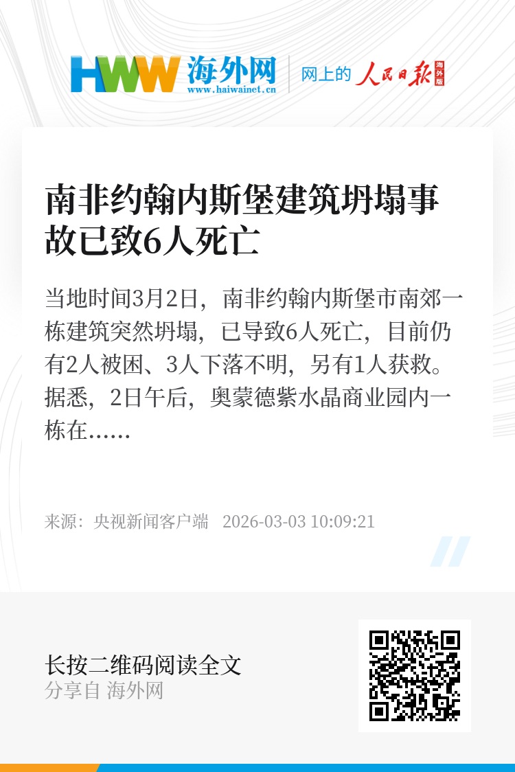当地时间3月2日,南非约翰内斯堡市南郊一栋建筑突然坍塌,已导致6人死亡,目前仍有2人被困、3人下落不明,另有1人获救。