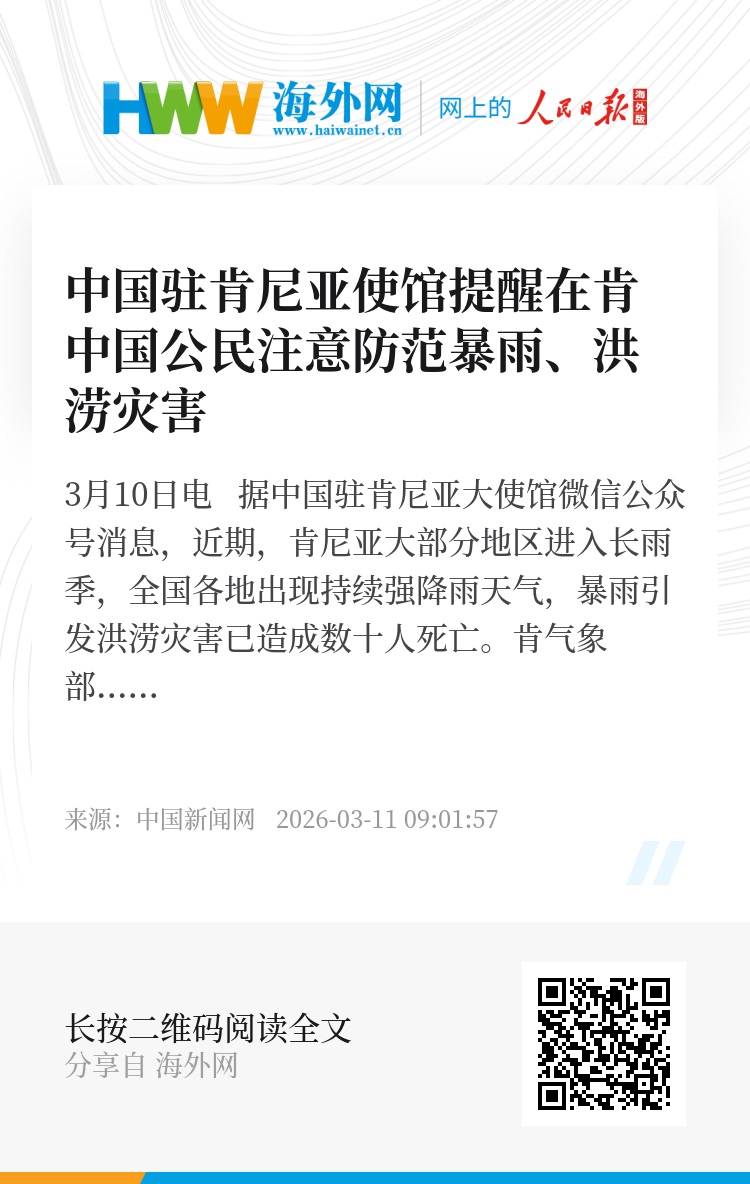 中国驻肯尼亚使馆提醒在肯中国公民和游客关注肯天气变化,特别是洪涝灾害预警,提高防汛和防疫意识。关注天气变化对航班、交通影响,尽量减少非必要外出,合理规划出行,避开灾害地段,做好应对预案。加强厂房、营地、住处等防洪防疫措施,必要时尽早转移至安全区域。外出期间远离水畔,暴雨天气远离电线杆、铁塔、树下和低洼区域,积水路段谨慎驾驶车辆。如遇危险情况请及时报警,并联系驻肯使馆寻求协助。