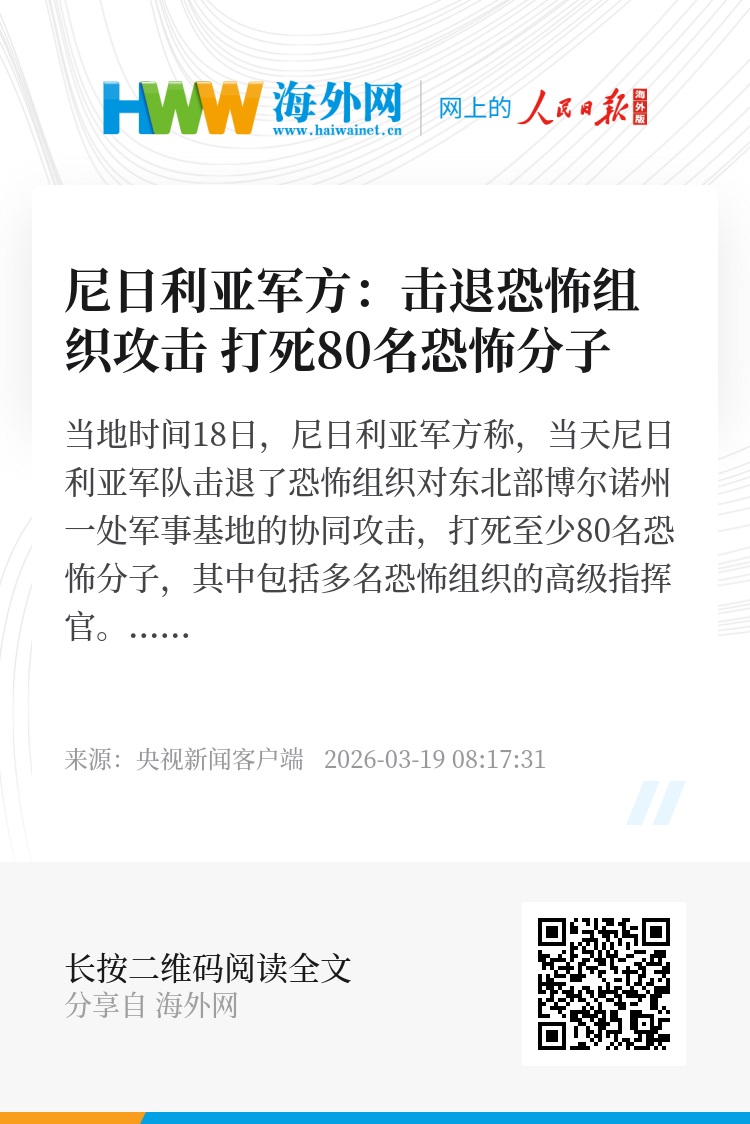 尼军事特遣部队发言人萨尼·乌巴披露,当天清晨恐怖分子试图袭击位于博尔诺州阿巴达姆地方政府区马拉姆·法托里的军队基地,该基地靠近邻国尼日尔,恐怖分子徒步推进并动用了武装无人机,尼部队官兵使用地面火力和空中支援挫败了此次袭击。(总台记者 何北平)