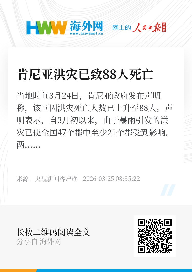 当地时间3月24日,肯尼亚政府发布声明称,该国因洪灾死亡人数已上升至88人。声明表示,自3月初以来,由于暴雨引发的洪灾已使全国47个郡中至少21个郡受到影响,两条河流决堤,超过3.4万人流离失所。
