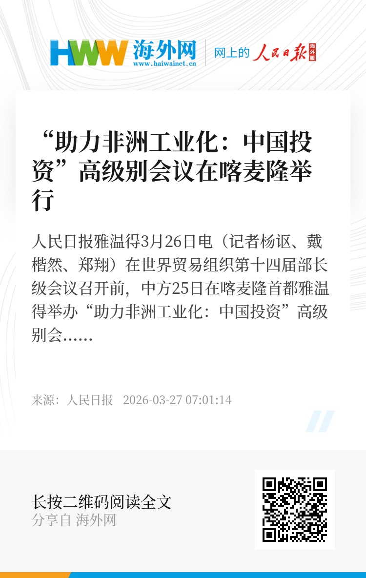 人民日报雅温得3月26日电(记者杨讴、戴楷然、郑翔)在世界贸易组织第十四届部长级会议召开前,中方25日在喀麦隆首都雅温得举办“助力非洲工业化:中国投资”高级别会议。世贸组织总干事伊维拉以及喀麦隆等近50个非洲成员的部长或代表参会。