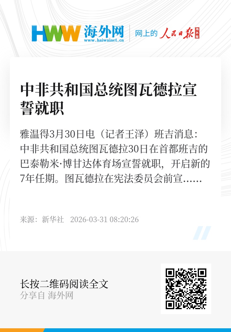 新华社雅温得3月30日电(记者王泽)班吉消息:中非共和国总统图瓦德拉30日在首都班吉的巴泰勒米·博甘达体育场宣誓就职,开启新的7年任期。